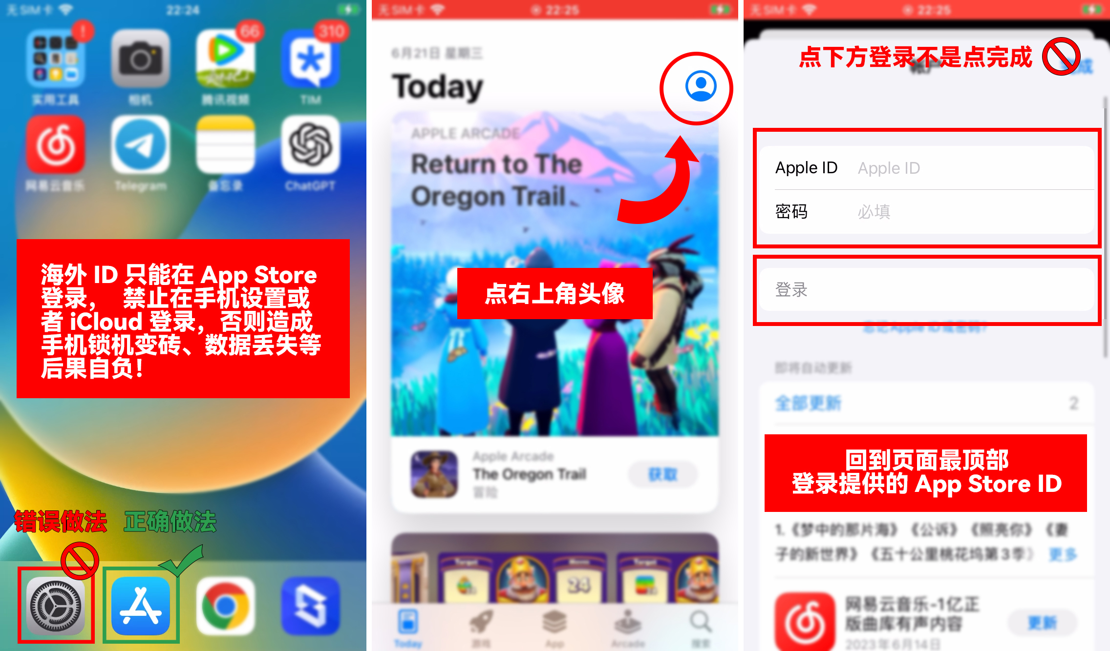 海外ID只能在App Store登录,🈲禁止在手机设置或者iCloud登录,否则造成手机锁机变砖、数据丢失等后果自负!
